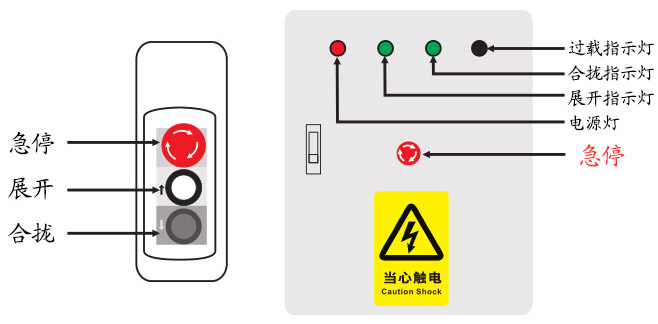 注:手柄開關(guān)使用方法為點動。長按展開按鈕即可展開,當看臺徹底展開時觸碰到限位開關(guān)會自動停止